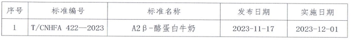 中國營養保健食品協會批準發布《A2 β-酪蛋白牛奶》團體標準(T/CNHFA 422—2023),現予公告,自2023年12月1日起實施。