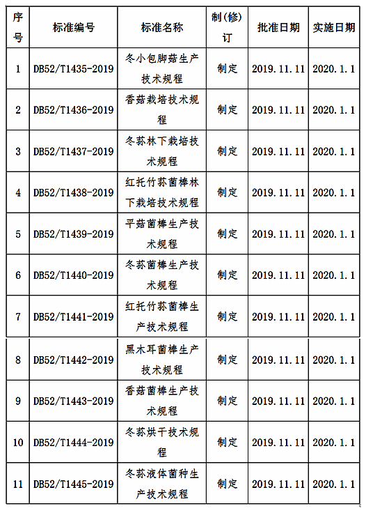 | 1 | DB52/T 1435-2019 | 冬小包腳菇生產(chǎn)技術(shù)規(guī)程 | 2019/11/11 | 2020/1/1 |