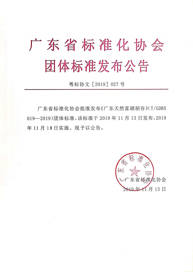 《廣東天然富硒稻谷》(T/GDBX 019-2019)