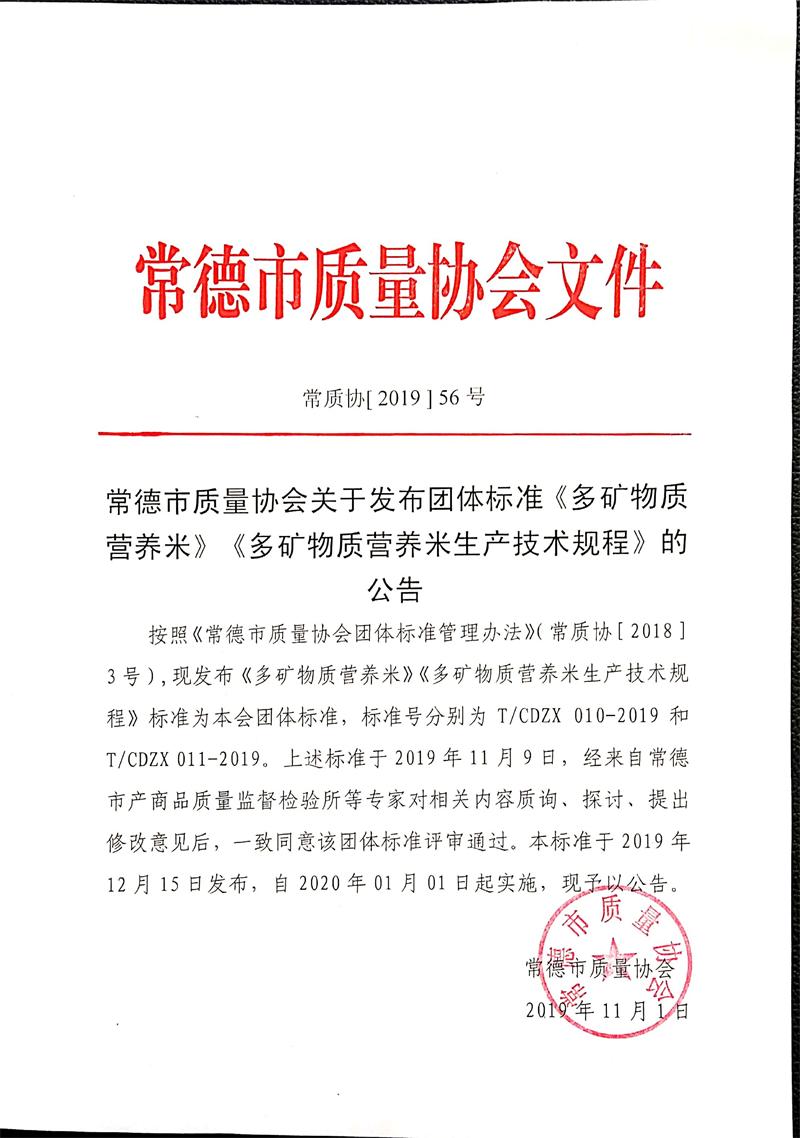 T/CDZX 010-2019《多礦物質營養米》 T/CDZX 011-2019《多礦物質營養米生產技術規程》