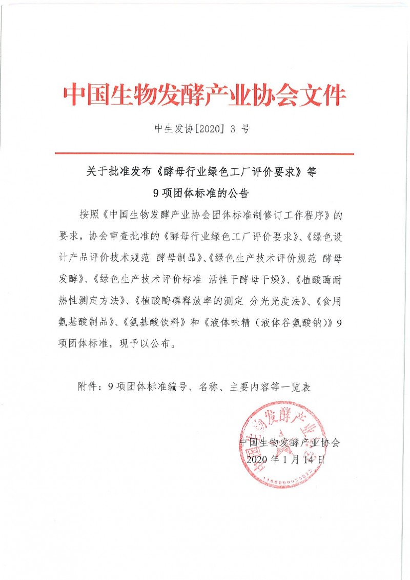 中國生物發酵產業協會關于批準發布《酵母行業綠色工廠評價要求》《氨基酸飲料》等9項團體標準的公告(中生發協[2020]3號)