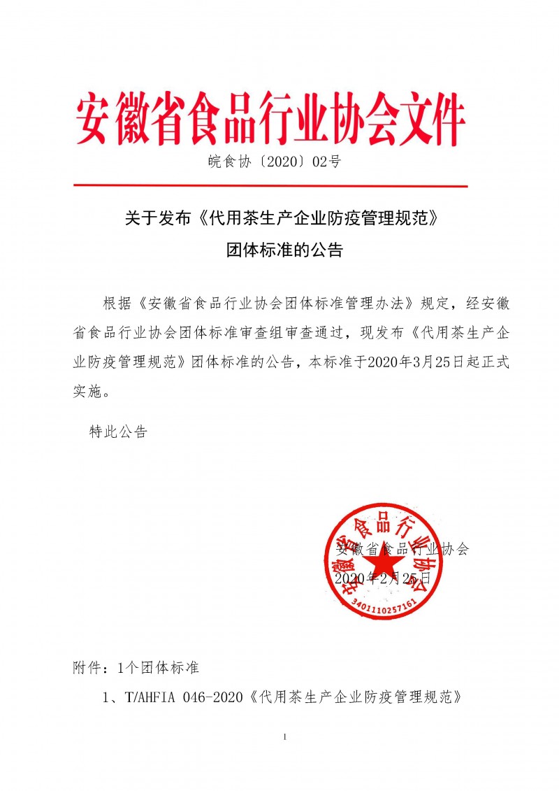 T/AHFIA 046-2020《代用茶生產企業防疫管理規范》