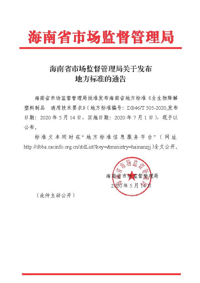 海南省地方標準《全生物降解塑料制品通用技術要求》(地方標準編號:DB46/T 505-2020,發布日期:2020 年5 月14 日,實施日期:2020 年7 月1 日)。