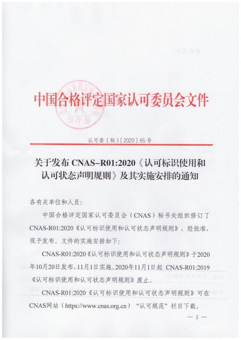 以上為中國合格評定國家認可委員會關于發布CNAS-R01:2020《認可標識使用和認可狀態聲明規則》及其實施安排的通知(認可委(秘)〔2020〕65號)的檢測服務介紹,如有其他疑問可聯系在線工程師!