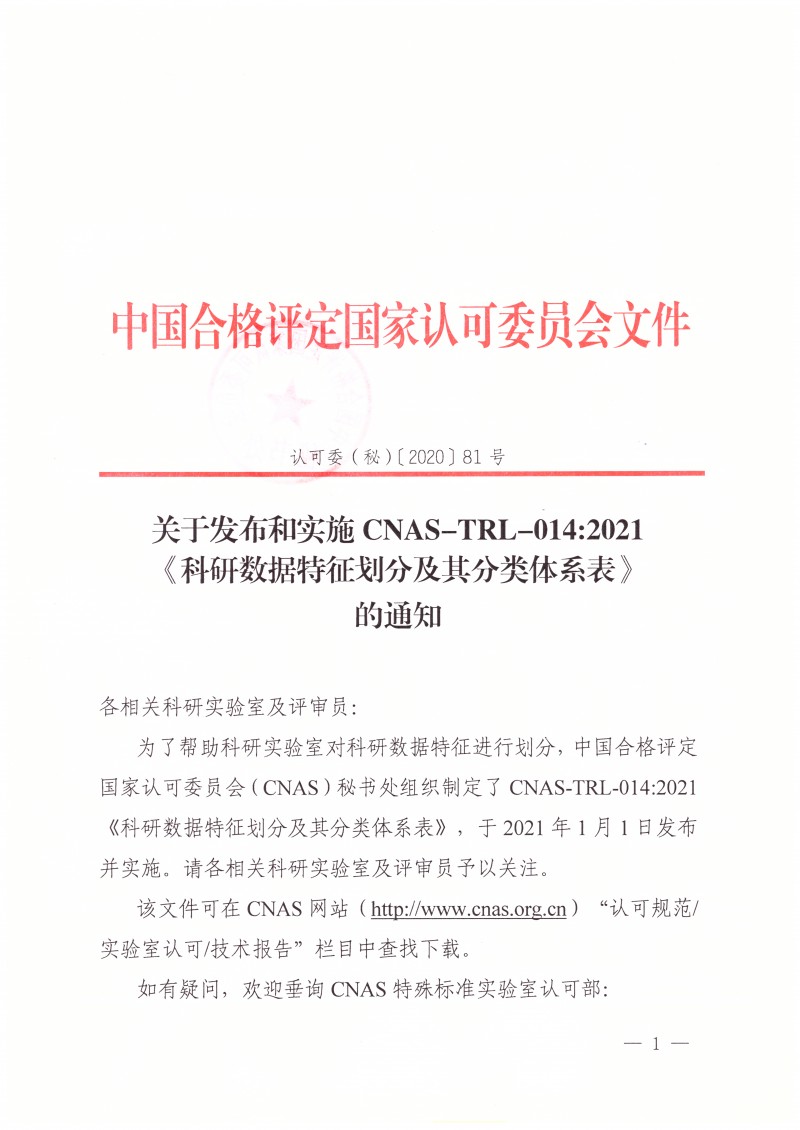 以上為中國合格評定國家認(rèn)可委員會關(guān)于發(fā)布和實施CNAS-TRL-014:2021《科研數(shù)據(jù)特征劃分及其分類體系表》通知(認(rèn)可委(秘)〔2020〕81號)的檢測服務(wù)介紹,如有其他疑問可聯(lián)系在線工程師!