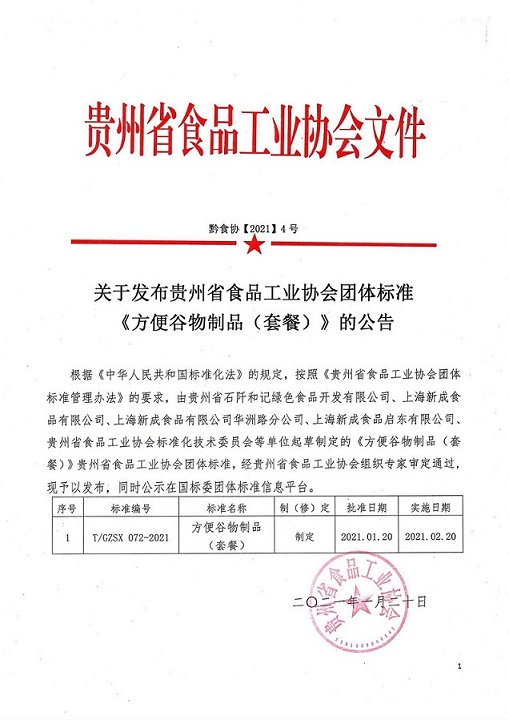 | 1 | T/GZSX072-2020 | 方便谷物制品(套餐) | 制定 | 2021.01.20 | 2021.02.20 |