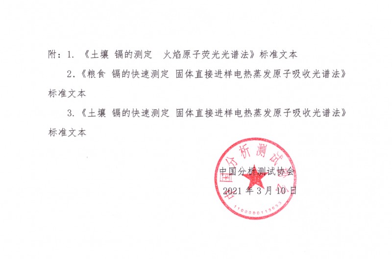 附件1:《土壤 鎘的測定 火焰原子熒光光譜法》標準文本.pdf 附件2:《糧食 鎘的快速測定 固體直接進樣電熱蒸發原子吸收光譜法》標準文本.pdf 附件3:《土壤 鎘的快速測定 固體直接進樣電熱蒸發原子吸收光譜法》標準文本.pdf