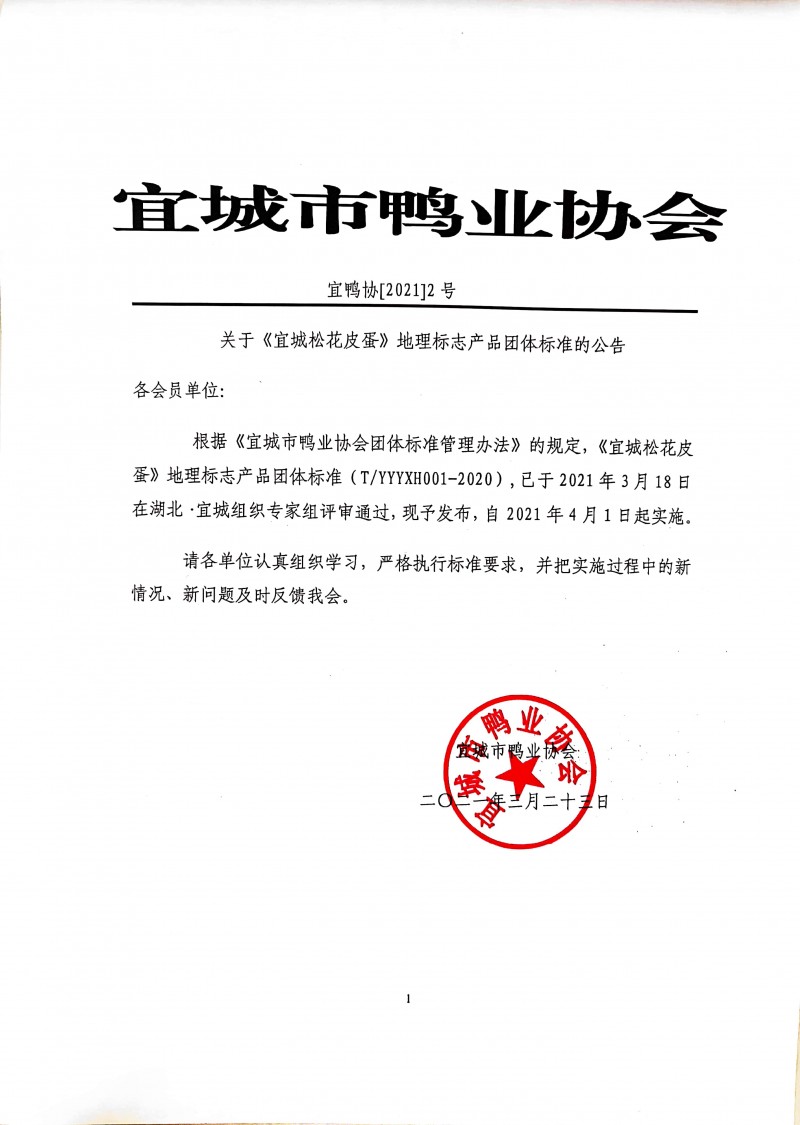 本文關(guān)鍵詞:宜城鴨業(yè)協(xié)會(huì)關(guān)于《地理標(biāo)志產(chǎn)品宜城松花皮蛋》團(tuán)體標(biāo)準(zhǔn)的公告(宜鴨協(xié)[2021]2號(hào)),標(biāo)準(zhǔn)公告 本文鏈接:http://www.eshzyl.cn/jcxm/bzgg/2025-02-18/16342.html
