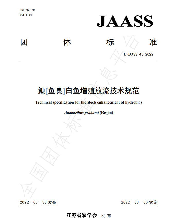 2022年3月30日,江蘇省農學會團體標準《鱇[魚良]白魚增殖放流技術規范》正式發布,標準編號為“T/JAASS 43-2022”。該標準是國家重點研發計劃“藍色糧倉科技創新”重點專項“高原湖泊漁業資源與生物多樣性保護模式示范”的重要產出成果之一,由中國科學院南京地理與湖泊研究所作為牽頭單位,玉溪市撫仙湖管理局、云南茂灣水產養殖有限責任公司作為參與單位共同編制。