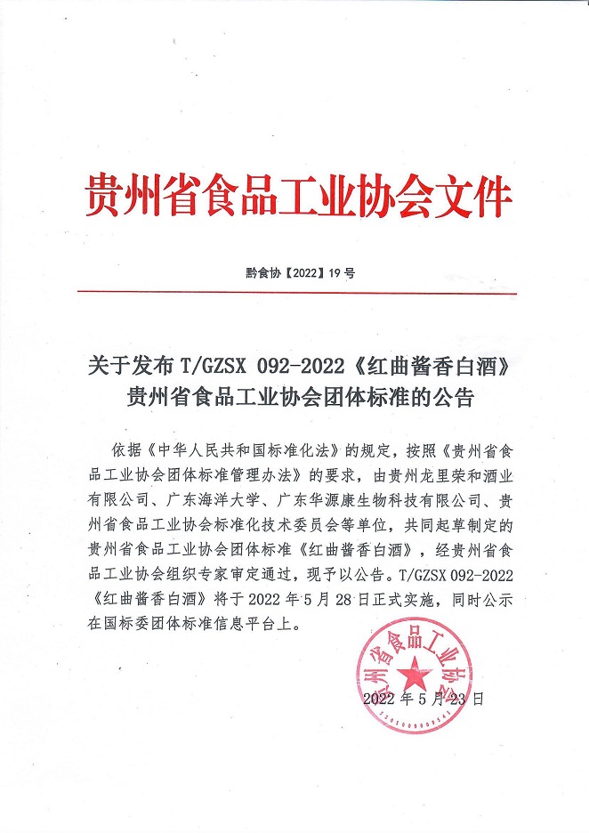 依據《中華人民共和國標準化法》的規定,按照《貴州省食品工業協會團體標準管理辦法》的要求,由貴州龍里榮和酒業有限公司、廣東海洋大學、廣東華源康生物科技有限公司、貴州省食品工業協會標準化技術委員會等單位,共同起草制定的貴州省食品工業協會團體標準《紅曲醬香白酒》,經貴州省食品工業協會組織專家審定通過,現予以公告。T/GZSX 092-2022《紅曲醬香白酒》將于2022年5月28日正式實施,同時公示在國標委團體標準信息平臺上。