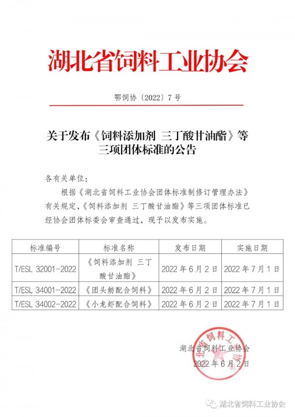T/ESL32001-2022 飼料添加劑 三丁酸甘油酯 T/ESL34001-2022 團頭魴配合飼料 T/ESL34002-2022 小龍蝦配合飼料