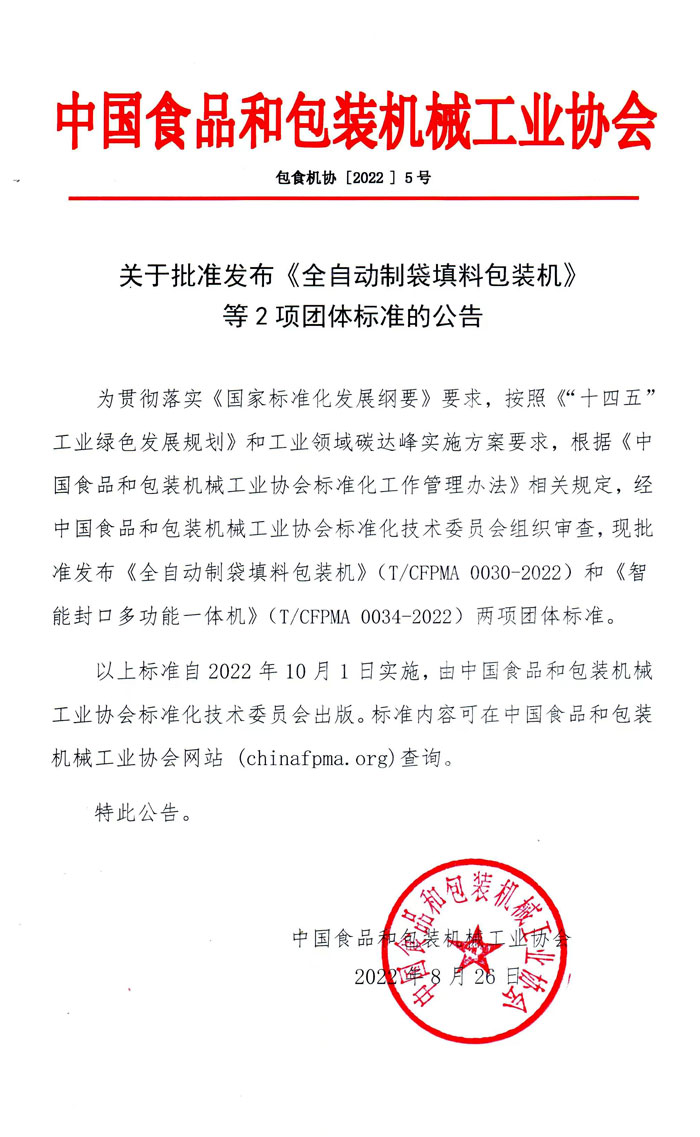 T/CFPMA 0030-2022 全自動(dòng)制袋填料包裝機(jī) T/CFPMA 0034-2022 智能封口多功能一體機(jī)