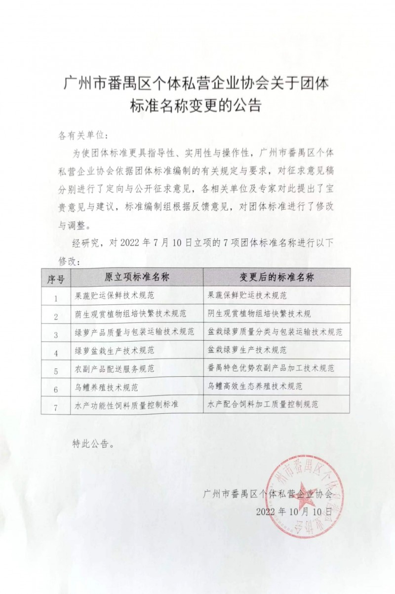 以上為廣州市番禺區(qū)個體私營企業(yè)協(xié)會關于團體標準名稱變更的公告的檢測服務介紹,如有其他疑問可聯(lián)系在線工程師!