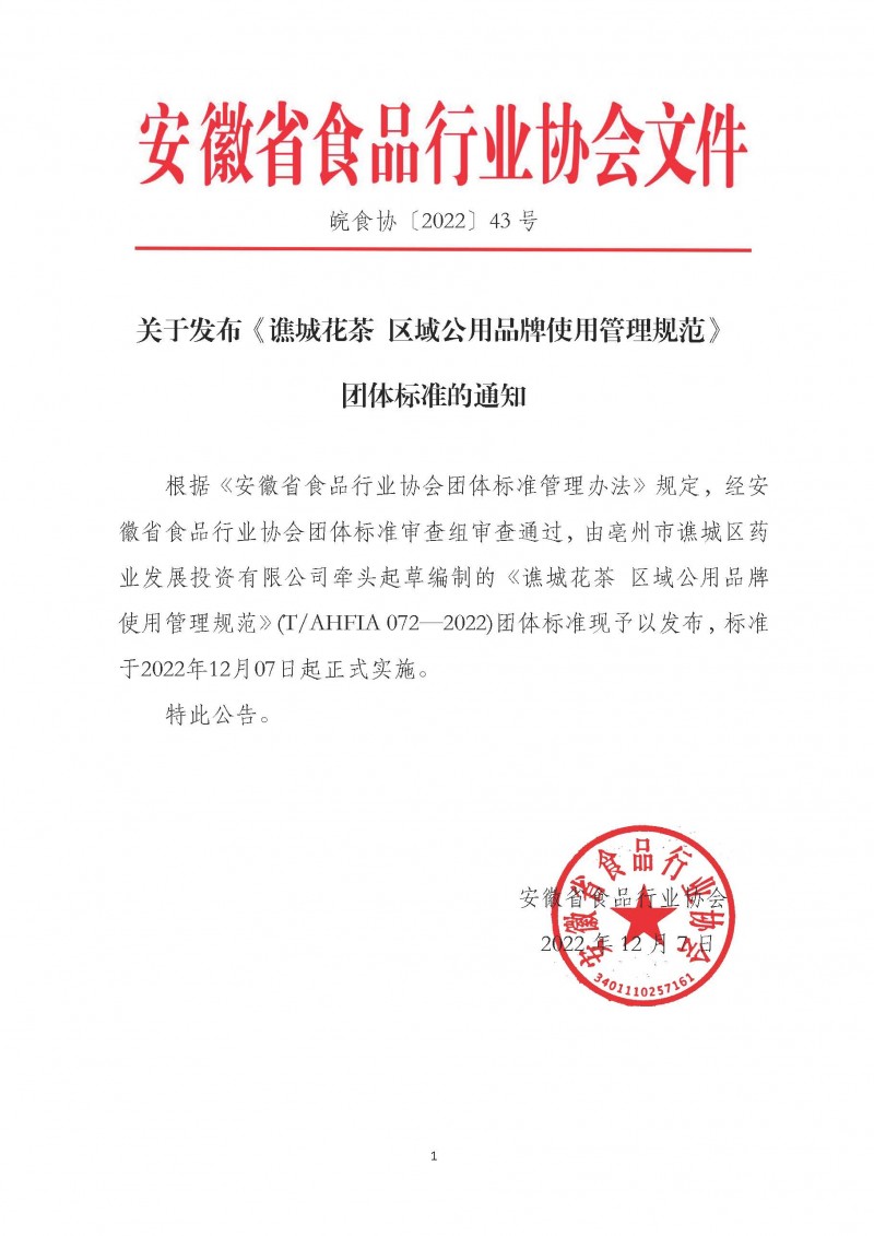 以上為安徽省食品行業(yè)協(xié)會關于發(fā)布《譙城花茶 區(qū)域公用品牌使用管理規(guī)范》團體標準的通知(皖食協(xié)〔2022〕43號)的檢測服務介紹,如有其他疑問可聯(lián)系在線工程師!