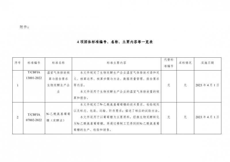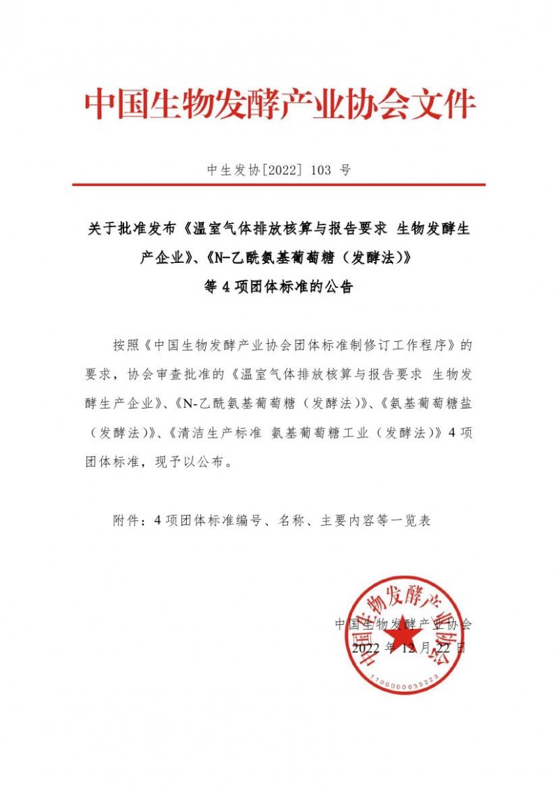 中國生物發酵產業協會關于批準發布《溫室氣體排放核算與報告要求 生物發酵生產企業》、《N-乙酰氨基葡萄糖(發酵法)》等4項團體標準的公告(中生發協[2022]103號)