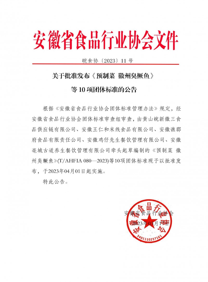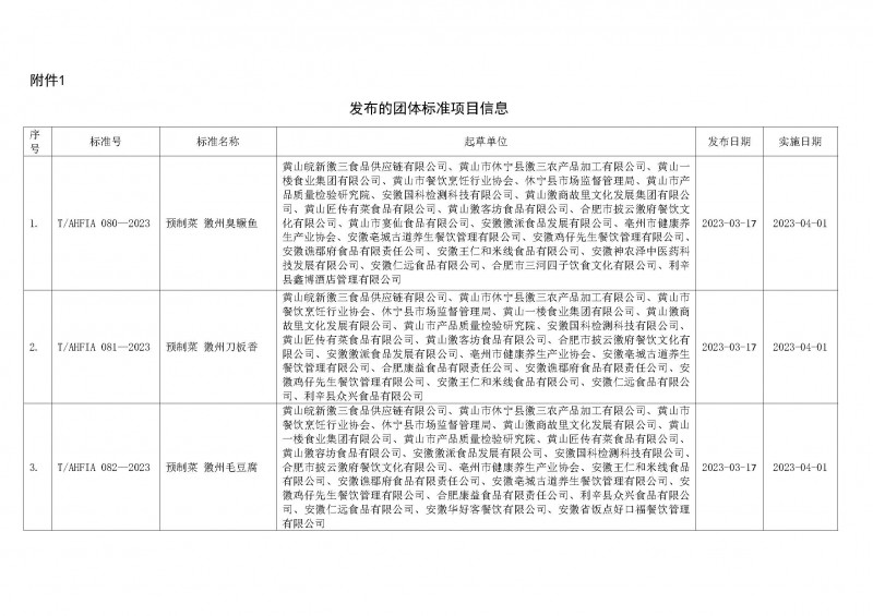 T/AHFIA 080-2023 預制菜 徽州臭鱖魚 T/AHFIA 081-2023 預制菜 徽州刀板香 T/AHFIA 082-2023 預制菜 徽州毛豆腐 T/AHFIA 083-2023 預制菜 徽州葛粉圓子 T/AHFIA 084-2023 預制菜 徽州干鍋燉 T/AHFIA 085-2023 預制菜 藥膳參杞牛肉 T/AHFIA 086-2023 預制菜 藥膳麻椒雞 T/AHFIA 087-2023 預制菜 藥膳芍花雞 T/AHFIA 088-2023 預制菜 炒葉芥菜 T/AHFIA 089-2023 預制菜 速食米線
