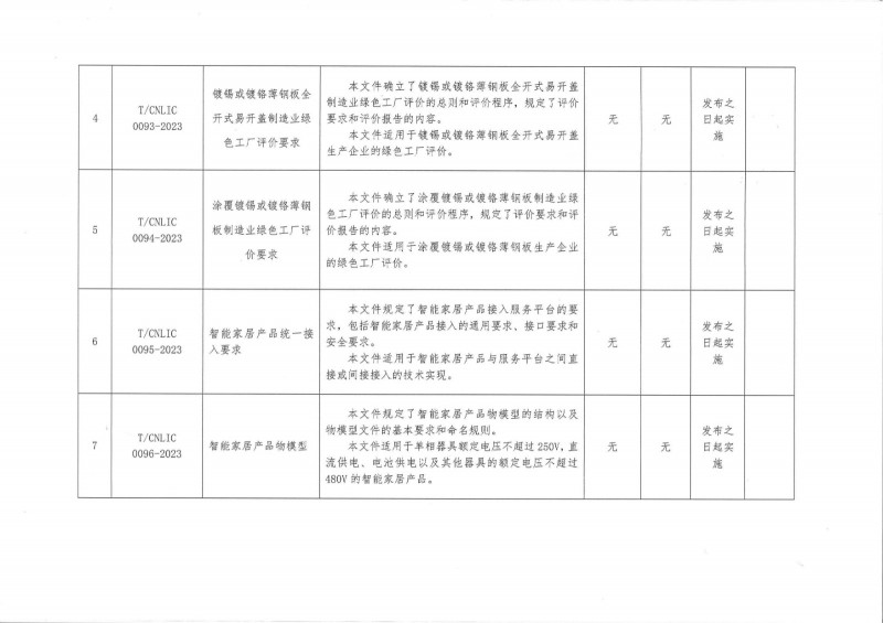 T/CNLIC 0091-2023 食品接觸用再生鋁合金薄板及容器 T/CNLIC 0092-2023 食品容器用螺紋旋開蓋制造業綠色工廠評價要求 T/CNLIC 0093-2023 鍍錫或鍍鉻薄鋼板全開式易開蓋制造業綠色工廠評價要求 T/CNLIC 0094-2023 涂覆鍍錫或鍍鉻薄鋼板制造業綠色工廠評價要求 T/CNLIC 0100-2023 使用或不使用化學阻垢劑的飲用水處理裝置效能評價規范