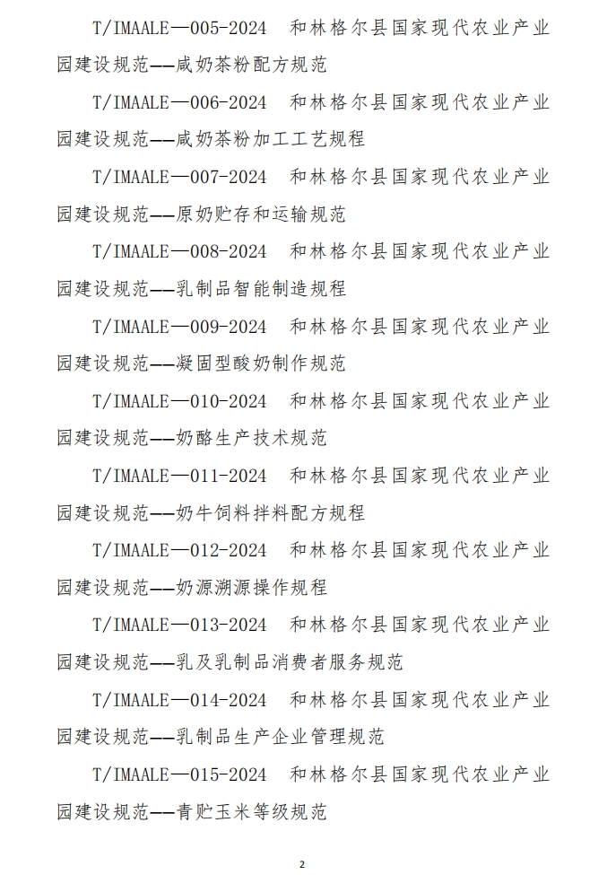 T/IMAALE 005-2024 和林格爾縣國家現代農業產業園建設規范-咸奶茶粉配方規范 T/IMAALE 006-2024 和林格爾縣國家現代農業產業園建設規范-咸奶茶粉加工工藝規程 T/IMAALE 007-2024 和林格爾縣國家現代農業產業園建設規范-原奶貯存和運輸規范 T/IMAALE 008-2024 和林格爾縣國家現代農業產業園建設規范-乳制品智能制造規程 T/IMAALE 009-2024 和林格爾縣國家現代農業產業園建設規范-凝固型酸奶制作規范 T/IMAALE 010-2024 和林格爾縣國家現代農業產業園建設規范-奶酪生產技術規范 T/IMAALE 011-2024 和林格爾縣國家現代農業產業園建設規范-奶牛飼料拌料配方規程 T/IMAALE 012-2024 和林格爾縣國家現代農業產業園建設規范-奶源溯源操作規程 T/IMAALE 013-2024 和林格爾縣國家現代農業產業園建設規范-乳及乳制品消費者服務規范 T/IMAALE 014-2024 和林格爾縣國家現代農業產業園建設規范-乳制品生產企業管理規范 T/IMAALE 015-2024 和林格爾縣國家現代農業產業園建設規范-青貯玉米等級規范 T/IMAALE 016-2024 和林格爾縣國家現代農業產業園建設規范-飼草工廠化加工生產規范