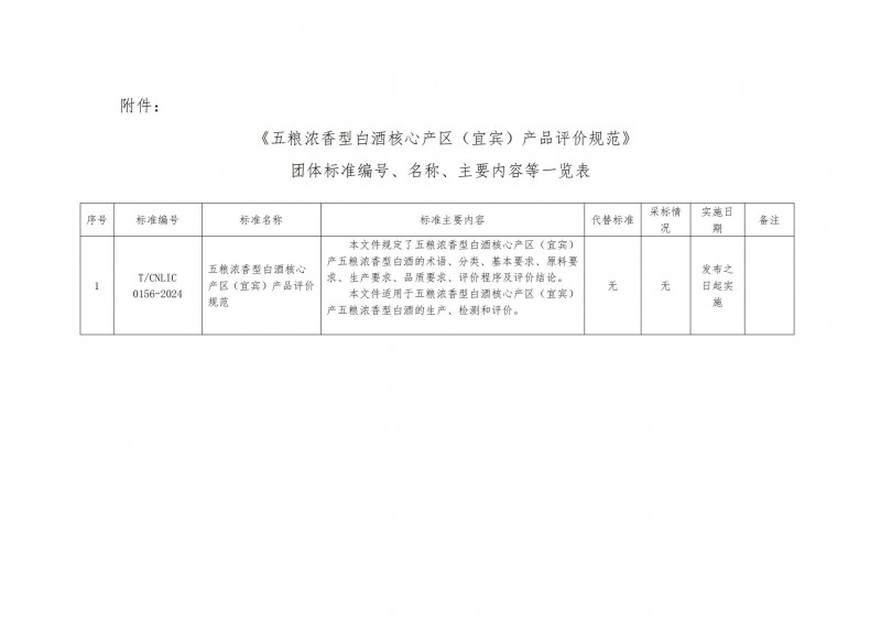 1、關于批準發布《五糧濃香型白酒核心產區(宜賓)產品評價規范》團體標準的公告